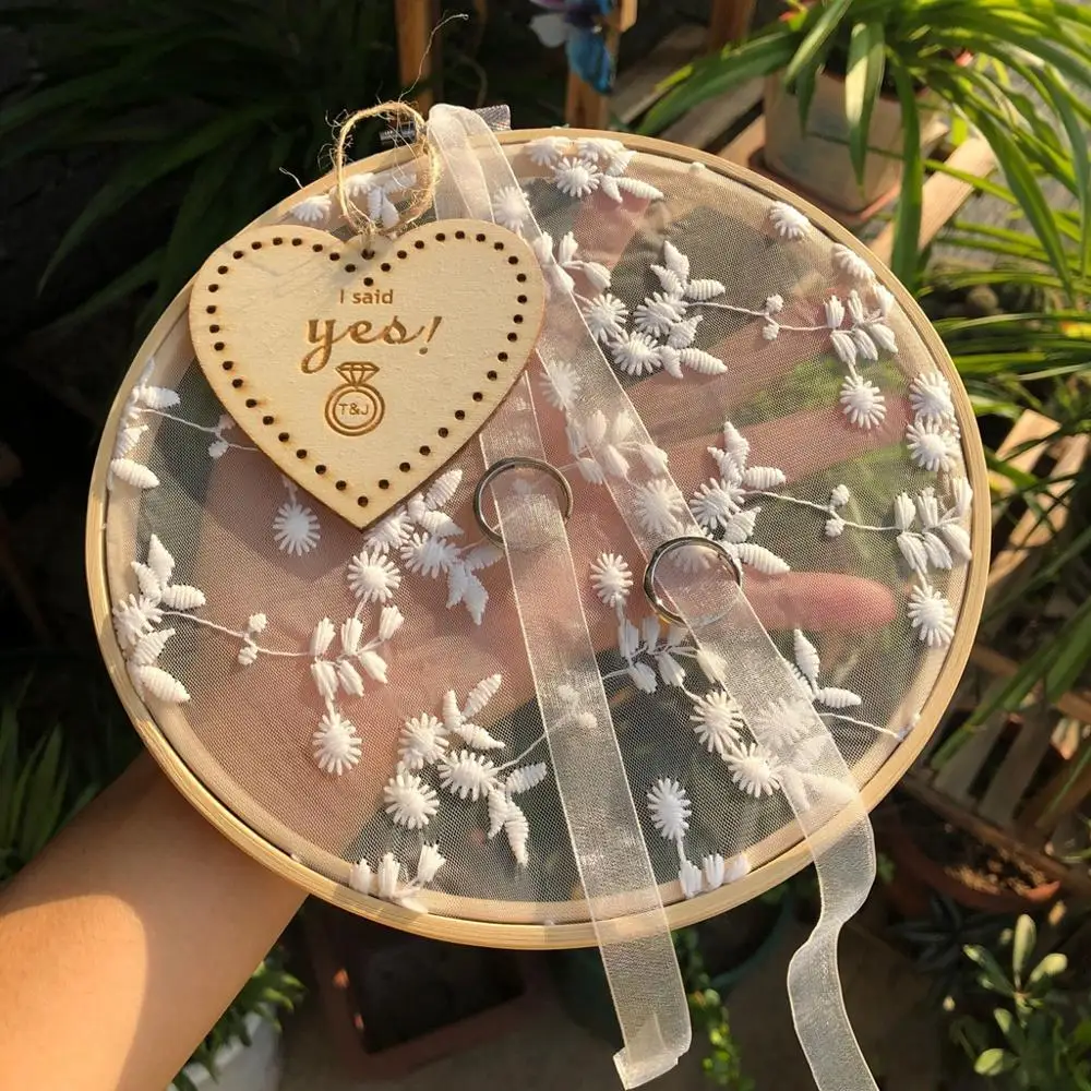 Hot Sale Personalized Wood Lace Round Ring Cushion Bearer Engagement Photo Props Wedding Proposal Marriage R