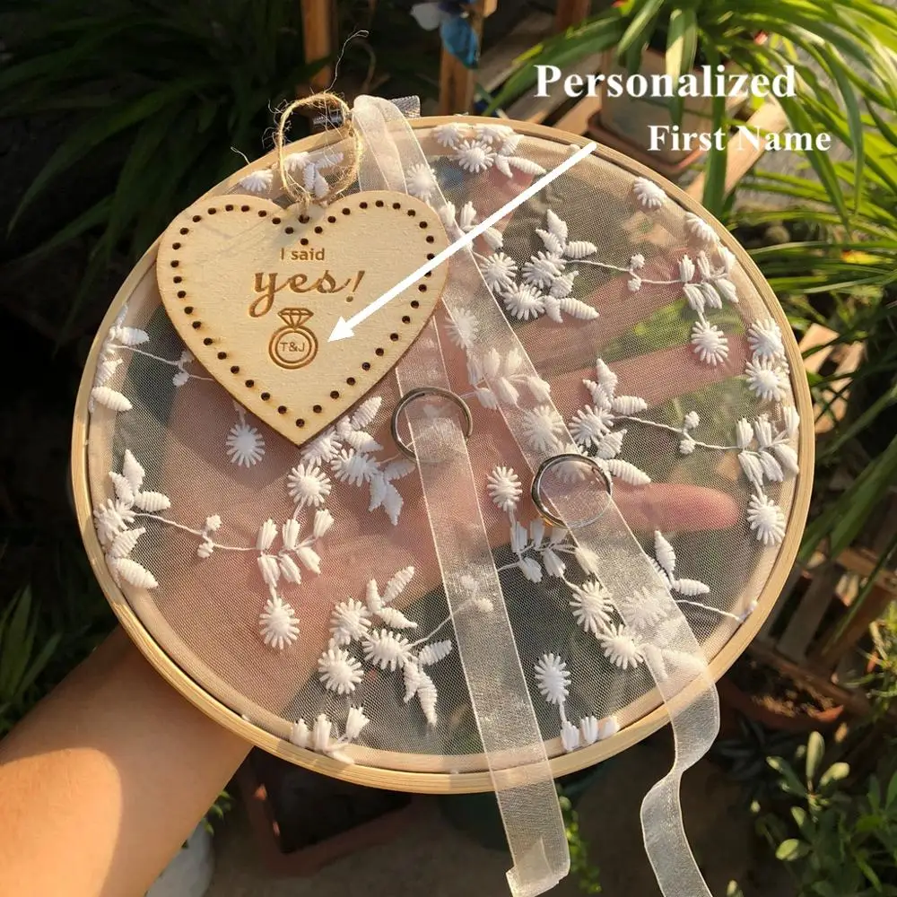 Personalized Wood Lace Round Ring Cushion Bearer Engagement Photo Props Wedding Proposal Marriage R